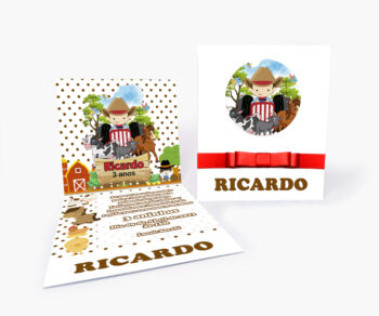 Convite Personalizado Infantil Aniversário Menino Fazendinha Marrom e Vermelho Poá