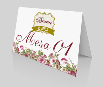 Placa de Mesa Numeração e agradecimento Aniversario 15 anos Flores Marsala e dourado